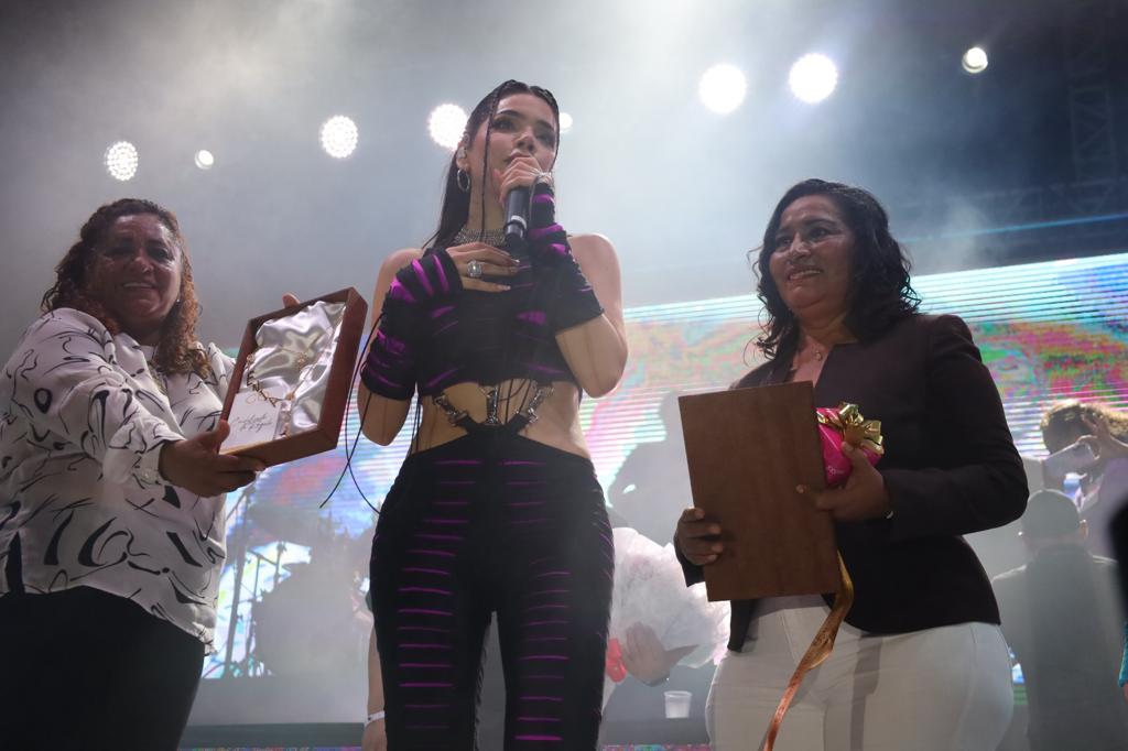 La presidenta, Abelina López, y la secretaria, Leticia Lozano Zavala, entregaron un presente a la artista, quien agradeció al Gobierno Municipal por invitarla al puerto.