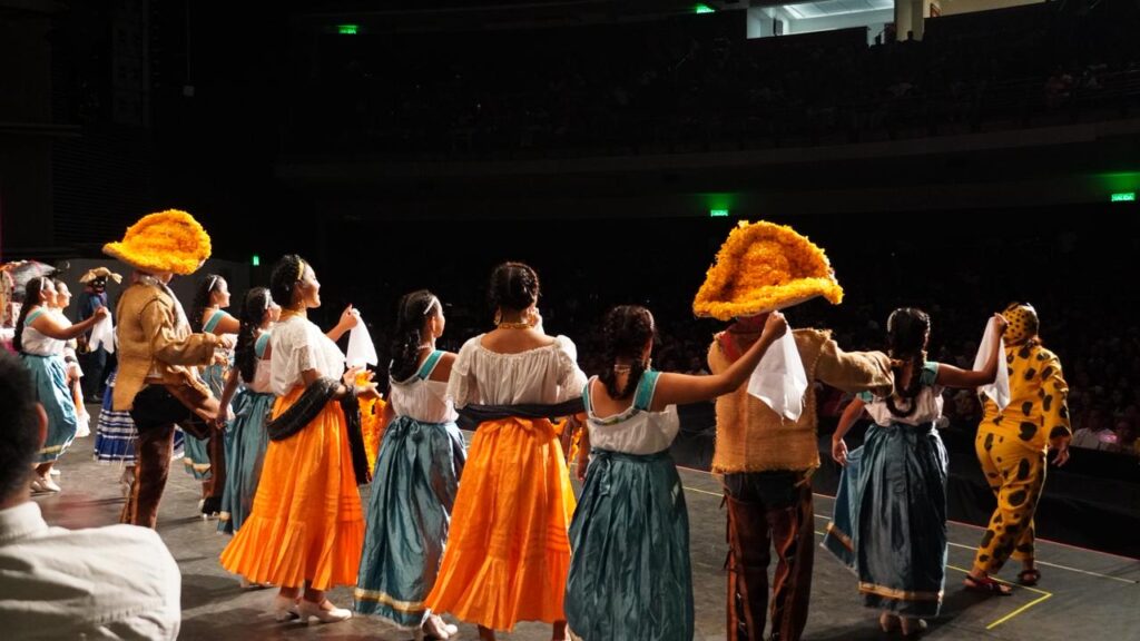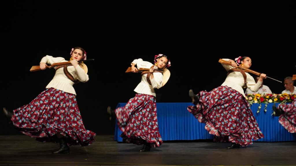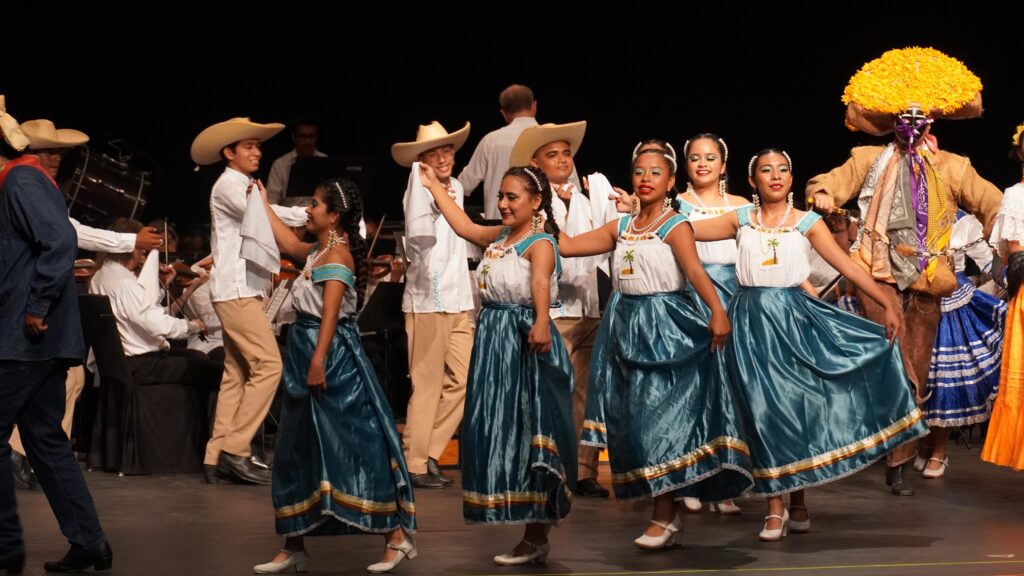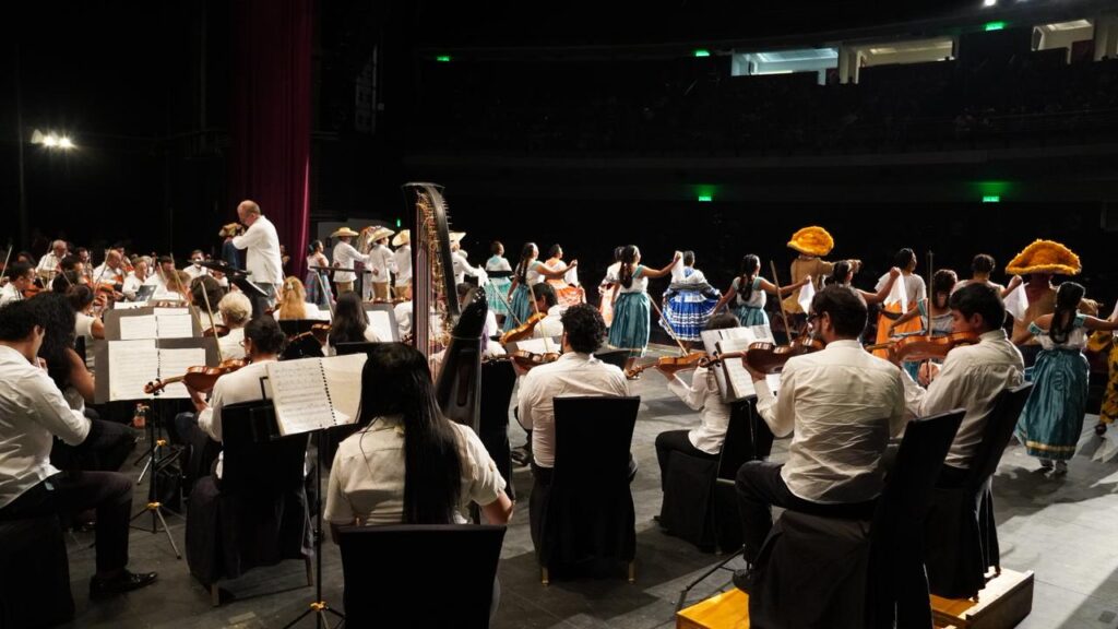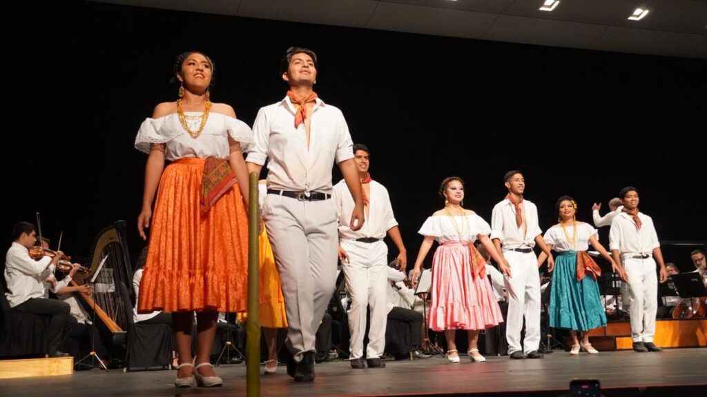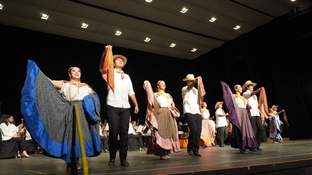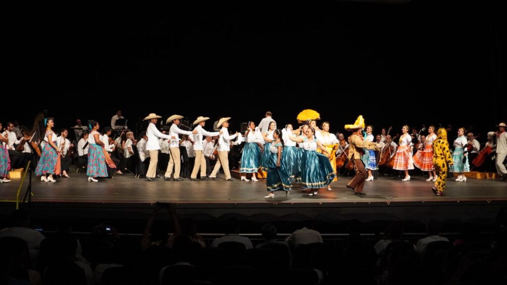 Uno de los momentos más emotivos fue la presentación del Ballet Folclórico Rarámuri, integrado por estudiantes del TecNM Acapulco, quienes compartieron el escenario con la Orquesta Filarmónica en una fusión de música, danza y color que conmovió al público y llenó el recinto de orgullo y aplausos.