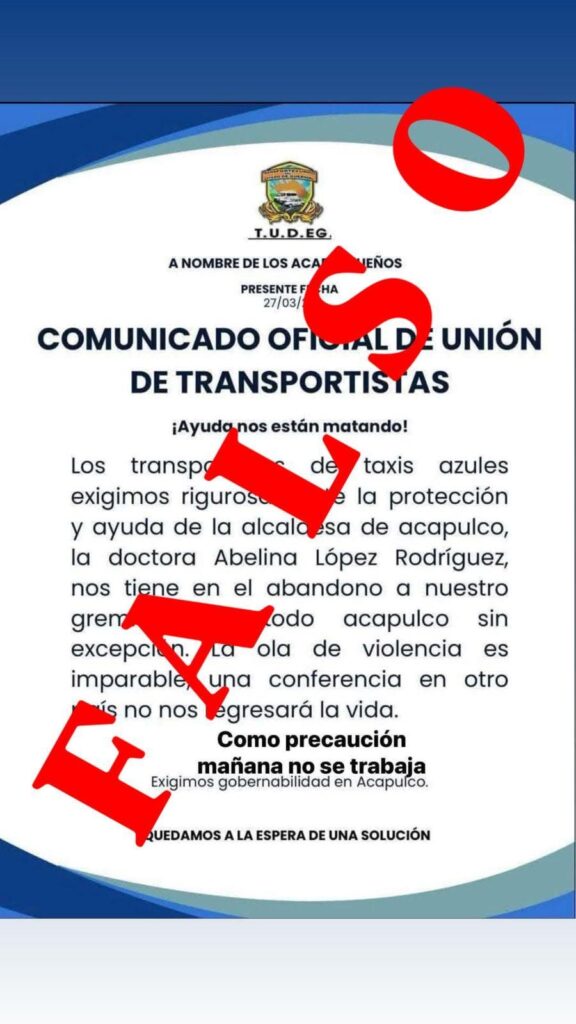 “Hacemos esta aclaración de forma categórica que su servidor Ulises Juárez, quien funge como presidente de la Federación de Transportes del Estado de Guerrero con las siglas de T.U.D E.G y ningún otro compañero que conforma la misma, hemos sido autores de estos desplegados donde toman como rehén el escudo de nuestra federación de forma irresponsable”, señala el texto.