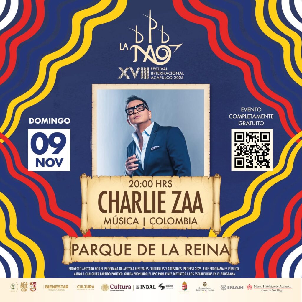 Acapulco, Gro., 8 de noviembre de 2025. — El próximo domingo 09 de noviembre dará inicio la edición XVIII del Festival Internacional La Nao 2025, uno de los eventos culturales más importantes de Guerrero, con la presentación estelar del cantante colombiano Charlie Zaa, en el Parque de la Reina.