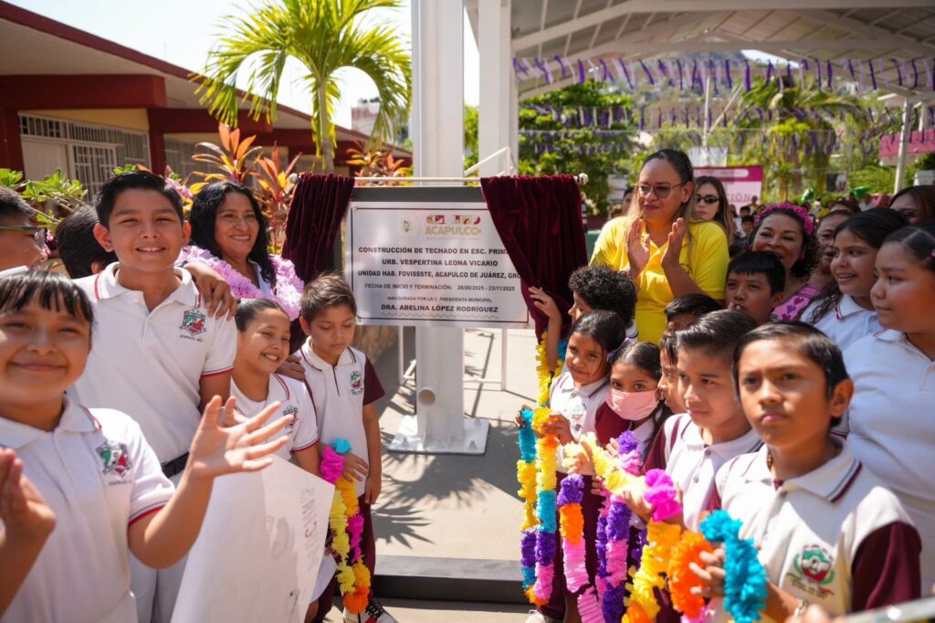 Acapulco, Gro., 09 de marzo de 2026.- La presidenta municipal, Abelina López Rodríguez, inauguró el techado de la Escuela Primaria Urbana Vespertina «Leona Vicario», en la Unidad Habitacional FOVISSSTE, con una inversión de 4 millones 698 mil pesos destinada a atender una demanda histórica de la comunidad escolar y mejorar las condiciones de aprendizaje de niñas y niños.