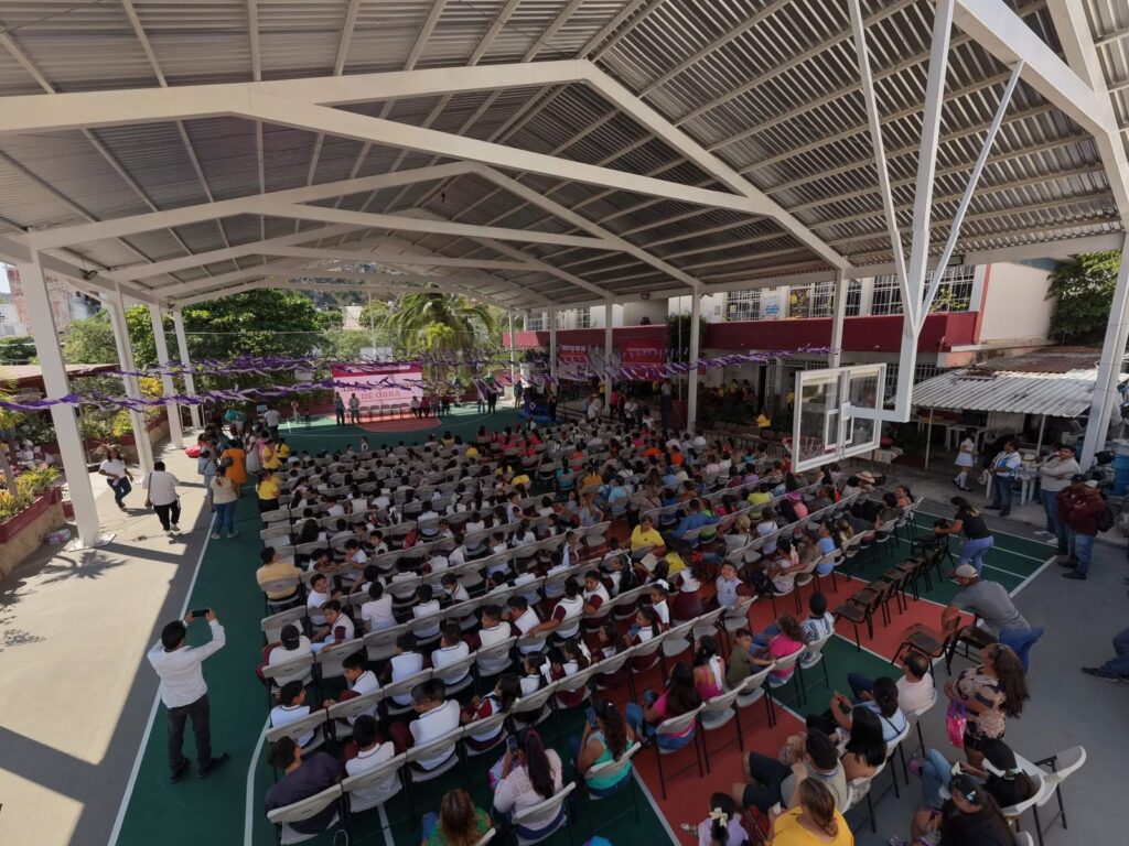 El director de Obras Públicas, Vladimir Hernández Alemán, precisó que el techado cubre 600 metros cuadrados e incluyó zapatas aisladas de 1.50×1.50×0.30 m, dados de cimentación de 0.60×0.60 m en 12 piezas, columnas de PTR de 12×6 pulgadas calibre 3/16, trabes de carga, lámina galvanizada, luminarias tipo reflector, piso de concreto premezclado con pintura acrílica antiderrapante, así como porterías y tableros de básquetbol, bajo estrictos estándares de calidad que garantizan la durabilidad de la estructura.