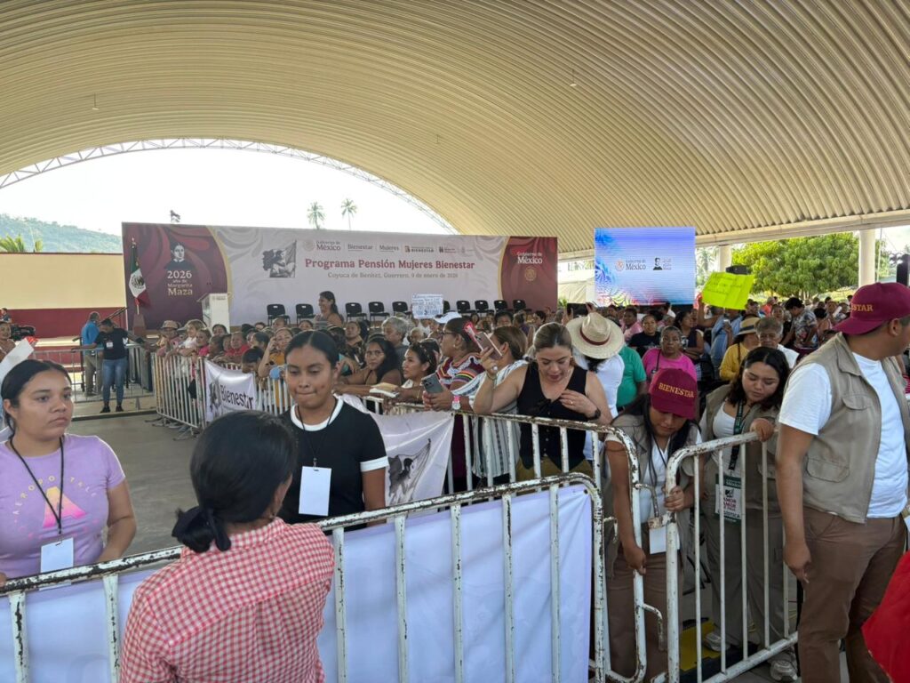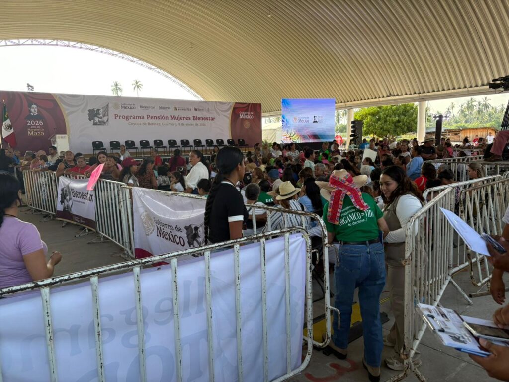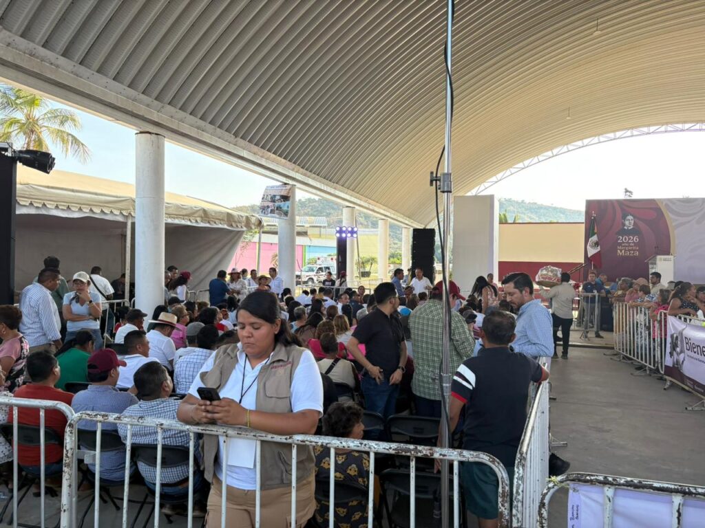 Unas dos mil personas esperan en el auditorio Ethel Diego, en el municipio de Coyuca de Benítez, a la presidenta de la República, Claudia Shembaun Pardo, donde pondrá en operación el programa Pensión Mujeres Bienestar.