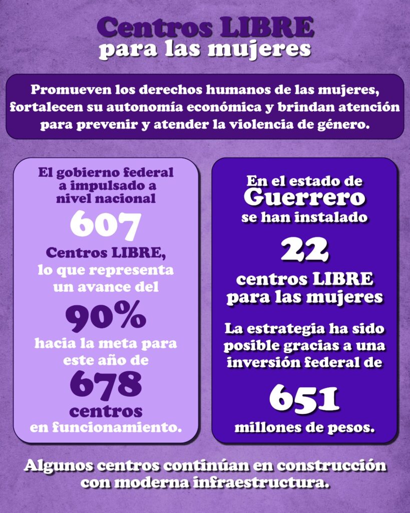 Chilpancingo, Gro., 05 de diciembre de 2025.- Gracias al apoyo de la presidenta de la República, Claudia Sheinbaum Pardo en Guerrero operan 22 Centros LIBRE para las mujeres, que brindan servicios de atención para promover sus derechos humanos, impulsar su autonomía económica, prevenir y atender las violencias.
