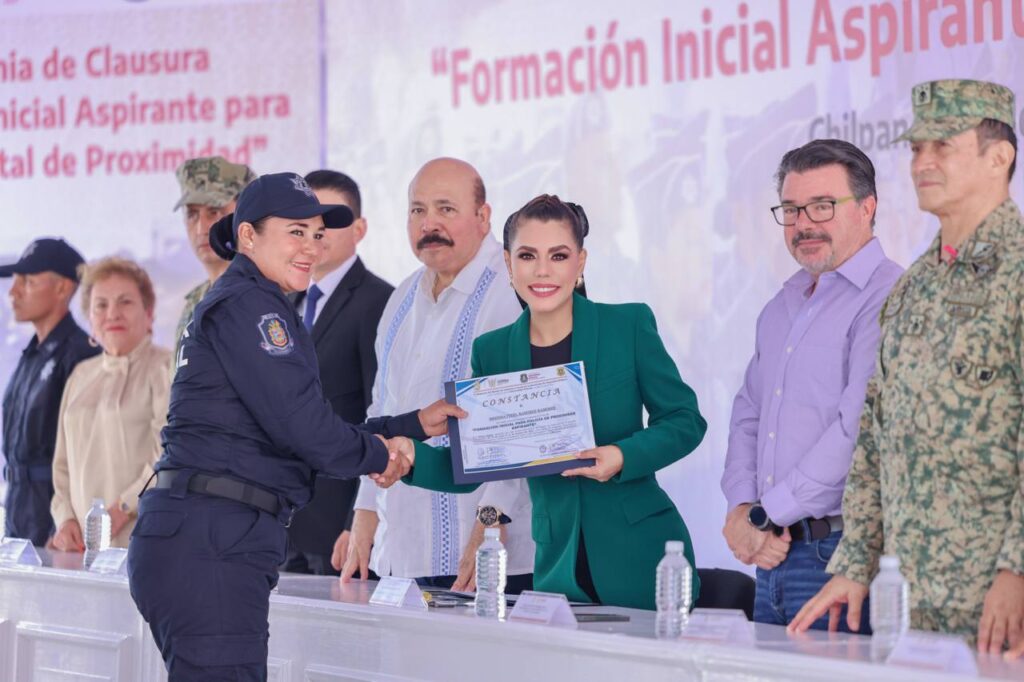 En la ceremonia, Evelyn Salgado entregó de manera simbólica constancias a las y los cadetes egresados de la Universidad Policial, junto con el secretario de Seguridad Pública Estatal, Daniel Antonio Ledesma, quien destacó que estos trabajos de formación policial están alineados a la estrategia Nacional de Seguridad del Gobierno de México.