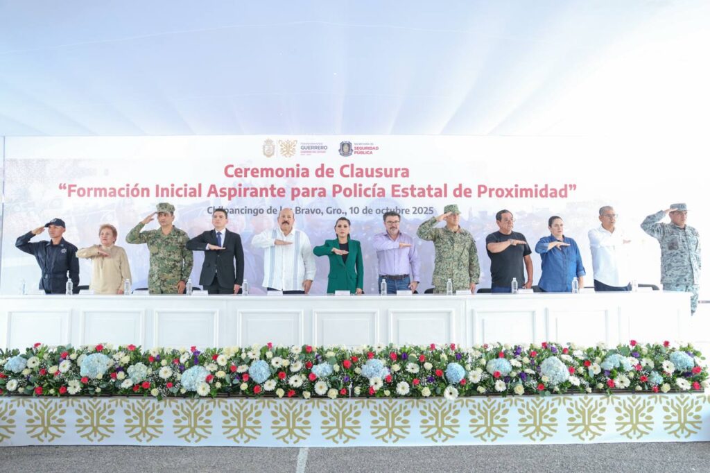 Chilpancingo, Gro., 10 de octubre de 2025. – La gobernadora Evelyn Salgado Pineda encabezó la ceremonia de graduación del primer escalón 2025 del Curso de Formación Inicial para Policía Estatal de Proximidad, donde 69 nuevos elementos, entre ellos 36 mujeres, culminaron su adiestramiento y capacitación especializada para incorporarse a los trabajos de paz, seguridad y atención ciudadana de la Secretaría de Seguridad Pública de Guerrero.