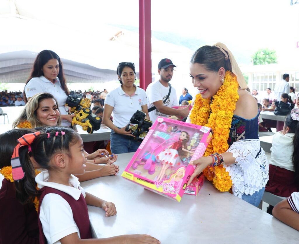 En este emotivo evento con la comunidad escolar de la Escuela Primaria «Amado Nervo» y de la Escuela Primaria «Caritino Maldonado, la presidenta del DIF Guerrero, Liz Salgado Pineda y la gobernadora Evelyn Salgado Pineda entregaron juguetes a las y los niños asistentes.