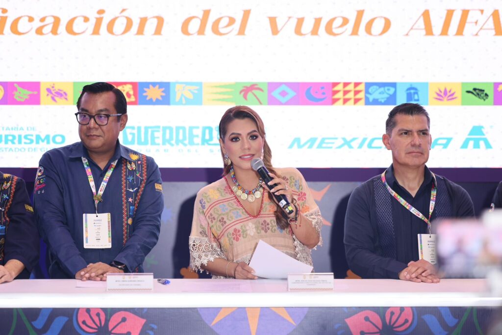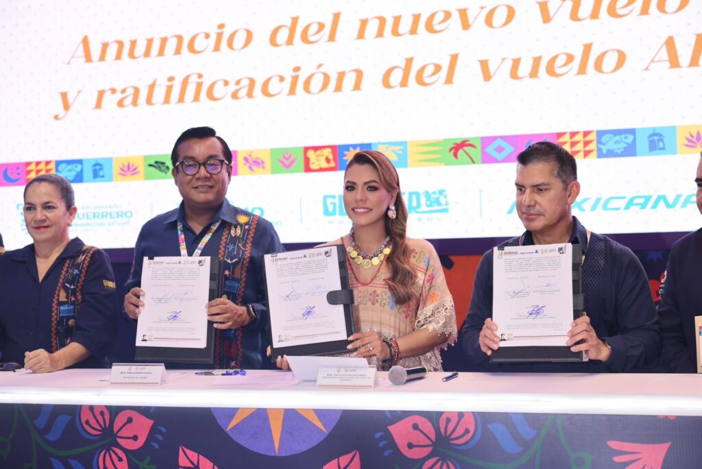 En un primer momento, la jefa del Ejecutivo estatal firmó el convenio de colaboración con la aerolínea Mexicana, en donde se anunció que a partir del mes de junio, se contará con el vuelo Aeropuerto Internacional Felipe Ángeles (AIFA)-Acapulco; en este contexto también se informó la ratificación del vuelo AIFA-Zihuatanejo.
