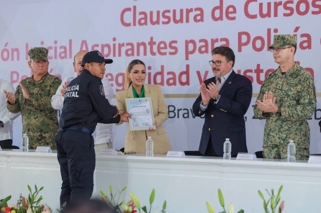 Acompañada por el secretario de Seguridad Pública Estatal, Daniel Ledesma Osuna, la mandataria estatal realizó la clausura oficial del curso de formación inicial aspirantes para Policía de Proximidad, Policía de Seguridad y Custodia Penitenciaria, en el que egresaron 80 nuevos elementos, 39 mujeres y 41 hombres, quienes concluyeron una preparación física, técnica y académica, orientada al respeto absoluto de los derechos humanos, disciplina operativa y capacidad de reacción ante situaciones de riesgo.