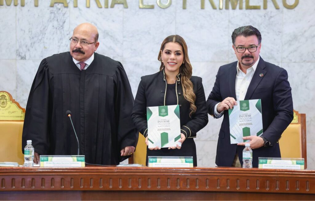Durante la Sesión Pública y Solemne conjunta de los Plenos del Tribunal Superior de Justicia y del Consejo de la Judicatura del Poder Judicial del Estado de Guerrero, el magistrado presidente, Ricardo Salinas Sandoval, acompañado por la titular del Poder Ejecutivo, Evelyn Salgado Pineda, y por el presidente del Poder Legislativo, Alejandro Carabias Icaza, rindió su informe de resultados correspondiente a su primer año de gestión, destacando los avances en materia de infraestructura, transparencia e impartición de justicia en Guerrero.