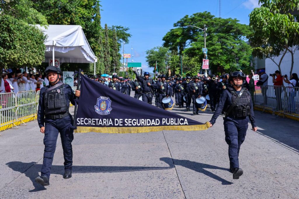 Le siguieron contingentes de instituciones públicas de seguridad, bomberos, Protección Civil, Cruz Roja Mexicana, cuerpos de rescate, brigadistas, instituciones educativas y organizaciones sociales de la capital guerrerense, cerrando con la participación de la asociación de charrería.