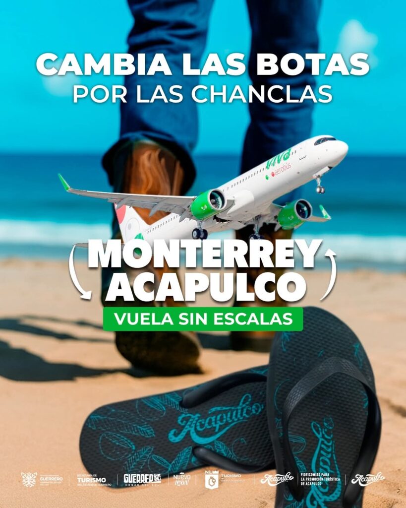 Acapulco, Gro., 23 de octubre de 2025.- A partir del lunes 3 de noviembre, el puerto de Acapulco y la ciudad de Monterrey estarán conectados de forma directa a través de la nueva ruta aérea operada por Viva Aerobús, que ofrecerá vuelos dos veces por semana —lunes y viernes—, facilitando el acceso al Hogar del Sol para visitantes del Norte del país.