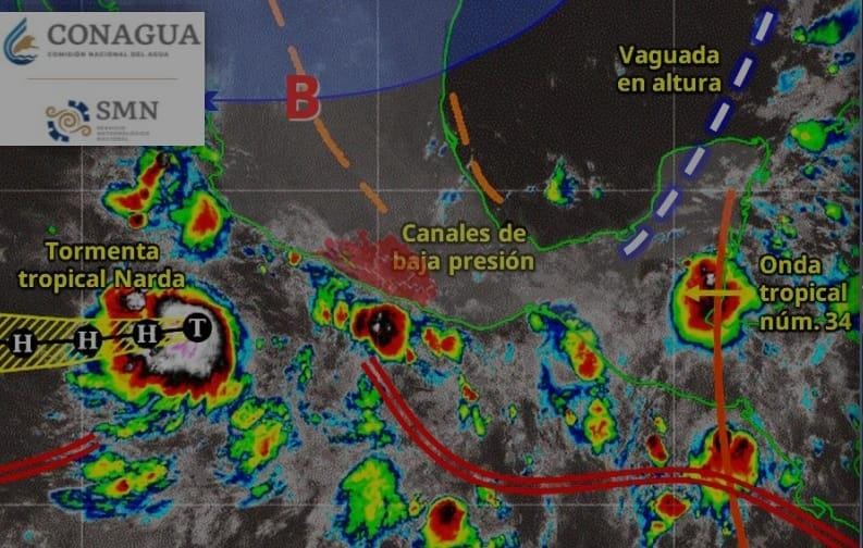 Asimismo, la tormenta tropical Narda se localizó esta mañana aproximadamente a 750 kilómetros al suroeste de Acapulco, y se prevé que hoy alcance la categoría de huracán mientras continúa alejándose gradualmente de las costas nacionales, sin representar riesgo para Guerrero.