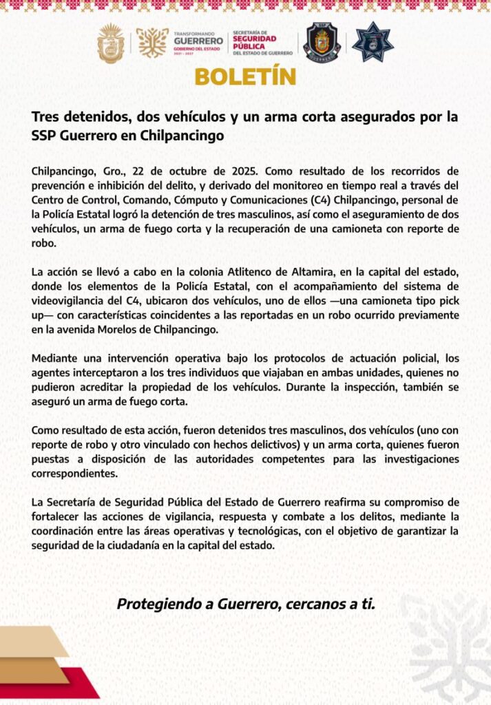 Chilpancingo, Gro., 22 de octubre de 2025. Como resultado de los recorridos de prevención e inhibición del delito, y derivado del monitoreo en tiempo real a través del Centro de Control, Comando, Cómputo y Comunicaciones (C4) Chilpancingo, personal de la Policía Estatal logró la detención de tres masculinos, así como el aseguramiento de dos vehículos, un arma de fuego corta y la recuperación de una camioneta con reporte de robo.