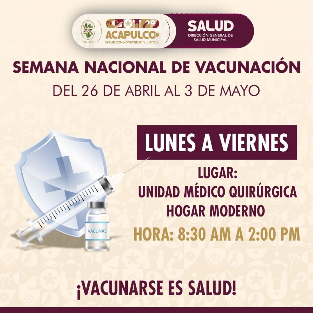 Acapulco, Gro., 27 de abril de 2025.- Como parte de las actividades de la «Semana Nacional de Vacunación 2025» del 26 al 03 de mayo, el Gobierno Municipal que preside Abelina López Rodríguez a través de la Dirección General de Salud implementará una jornada intensiva para proteger la salud de las niñas y niños acapulqueños.