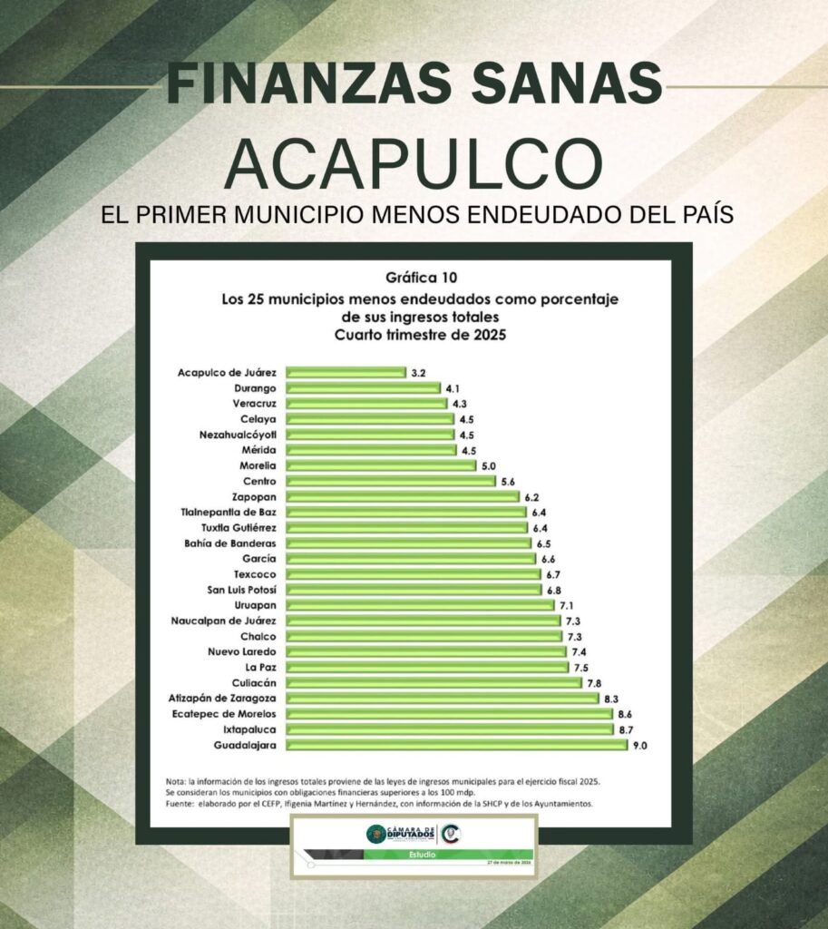 Al inicio de su gestión, en 2021, el municipio figuraba entre los ayuntamientos con mayores niveles de deuda. Hoy, tras cuatro años de acciones estratégicas, el puerto ascendió del lugar 23 al primero entre los municipios con menor endeudamiento, de acuerdo con el informe del Centro de Estudios de las Finanzas Públicas de la Cámara de Diputados, que refleja un progreso en las finanzas municipales.