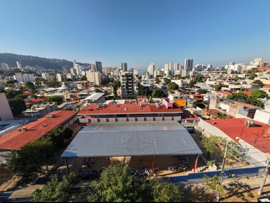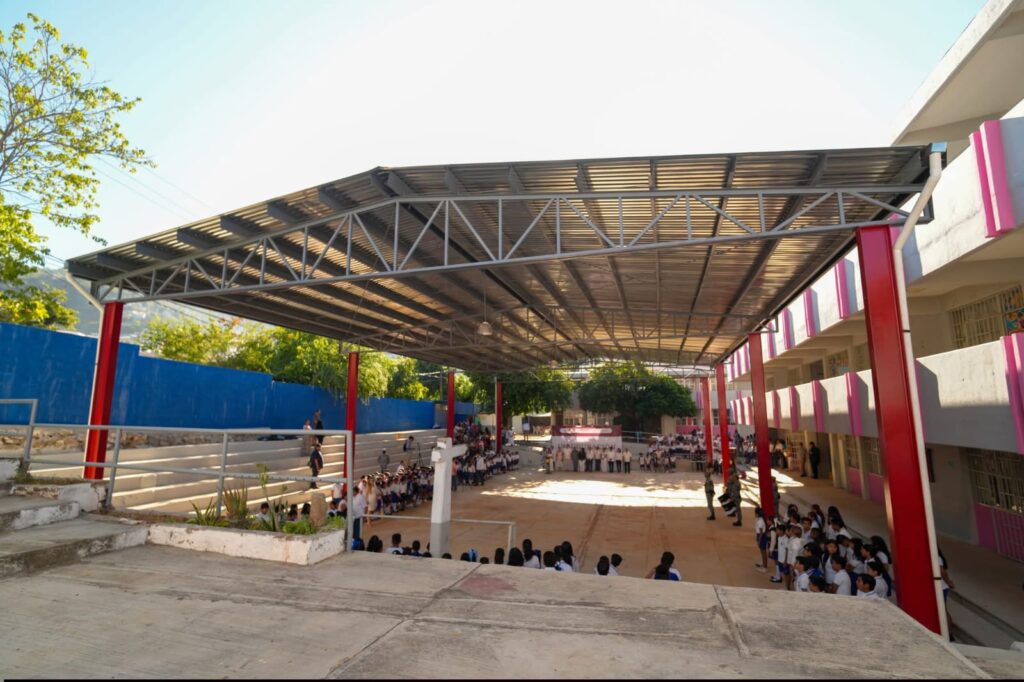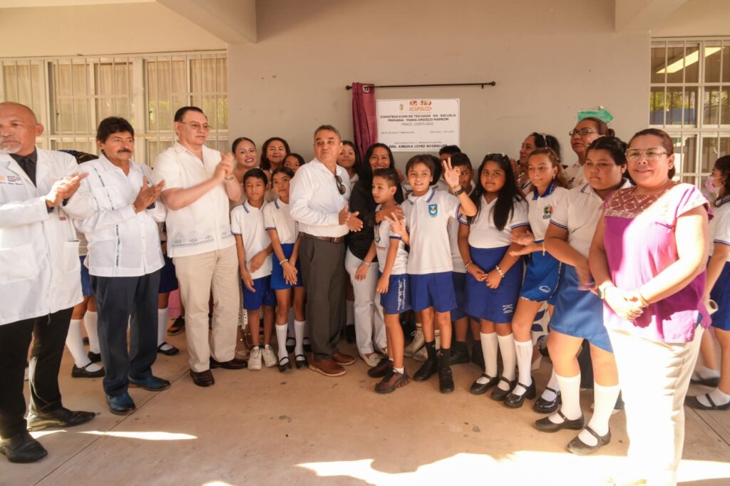 Acapulco, Gro., 12 de enero de 2026.- Con la nueva techumbre entregada por la presidenta municipal, Abelina López Rodríguez, los estudiantes de la Escuela Primaria María Orozco de Marrón cuentan ahora con un espacio renovado para sus actividades recreativas, académicas y deportivas.