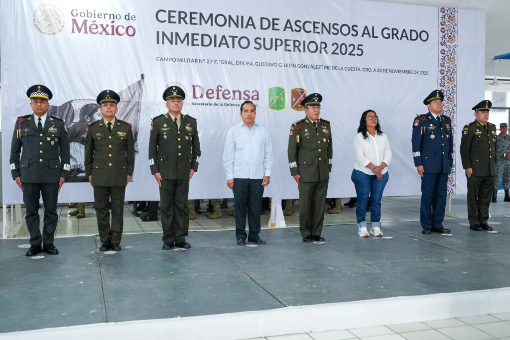 Acapulco, Gro., 20 de noviembre de 2025.- La Comandancia de la Vigésima Séptima Zona Militar llevó a cabo el acto de ascensos al grado inmediato superior correspondiente a los certámenes de la Promoción General Superior 2025, ceremonia que contó con la participación de la presidenta municipal Abelina López Rodríguez y fue presidida por el General de División Diplomado de Estado Mayor José Roberto Flores Montes de Oca, comandante de la Novena Región Militar.