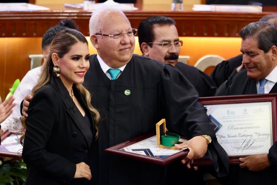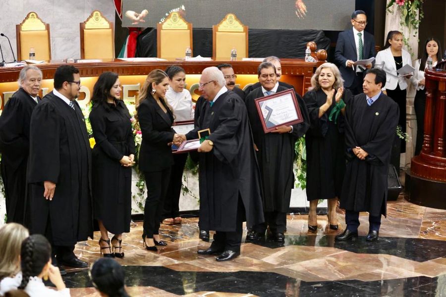 En el evento, la gobernadora; el presidente del Tribunal Superior de Justicia y del Consejo de la Judicatura del Poder Judicial, Raymundo Casarrubias Vázquez, entregaron reconocimientos y condecoraciones al Mérito Judicial a magistrados y jueces en funciones, en retiro, post mortem y personal jurisdiccional de este órgano autónomo.