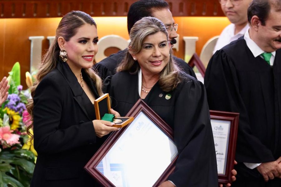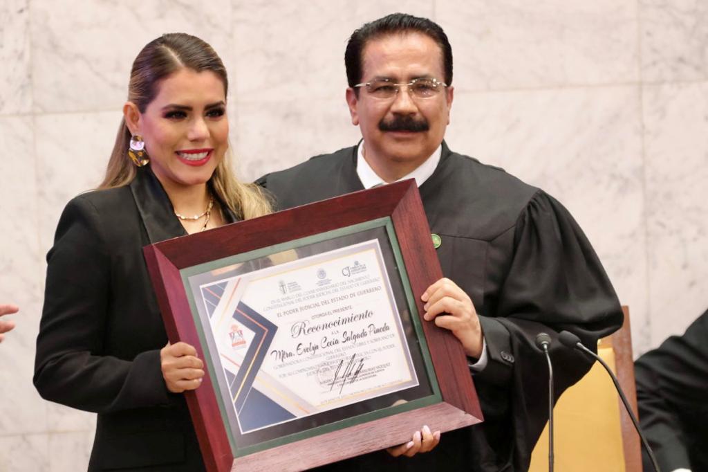 En sesión pública y solemne del Tribunal Superior de Justicia, la gobernadora Evelyn Salgado recibió del titular del Tribunal Superior de Justicia, Raymundo Casarrubias Vázquez, un reconocimiento por su compromiso, solidaridad y respaldo institucional al Poder Judicial en el fortalecimiento de la impartición de justicia en Guerrero.