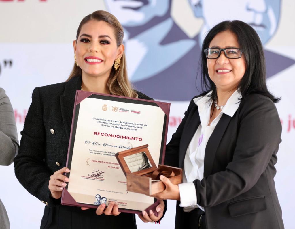 Durante la ceremonia, la gobernadora acompañada por el senador Félix Salgado Macedonio y el secretario General de Gobierno, Ludwig Marcial Reynoso Núñez, realizó la entrega de premios al Mérito Jurídico 2023.