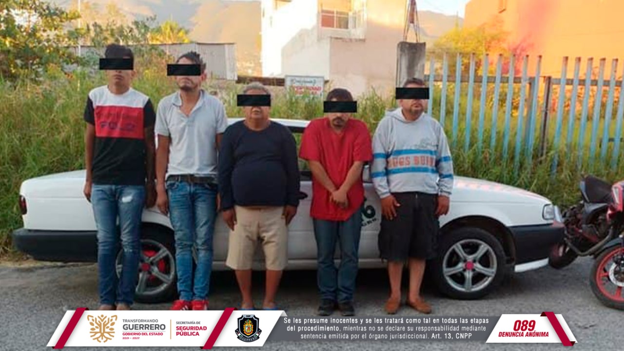 Las personas fueron identificadas como Hilario “N”, Misael “N”, José “N”, Genaro “N” y Daniel “N”, quienes iban a bordo de un vehículo del servicio de transporte público, marca Nissan, tipo Tsuru, número económico 1246 con placas del estado de Guerrero y una motocicleta marca Italika, tipo Urban Work, modelo 2020; ambos sin reporte de robo.
