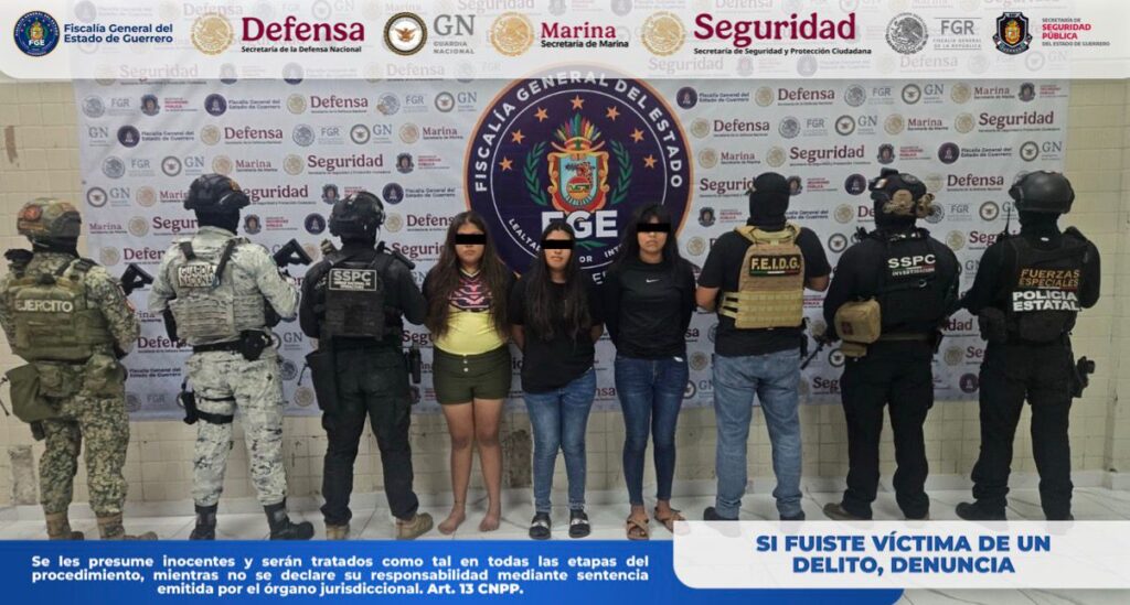 Chilpancingo, Gro., a 26 de marzo de 2026.– Como resultado de acciones operativas coordinadas, la Fiscalía General del Estado de Guerrero, en conjunto con DEFENSA, Guardia Nacional (GN), Secretaría de Seguridad y Protección Ciudadana (SSPC) y Policía Estatal (SSPGro), logró la detención en flagrancia de Karla “N”, Neidi “N” y Erika “N” en el municipio de Juan R. Escudero, Guerrero.