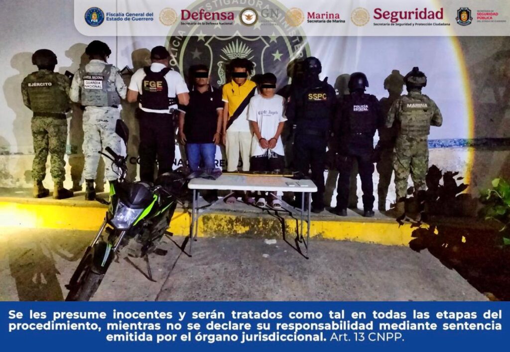 Chilpancingo, Gro., a 28 de noviembre de 2025. – La Fiscalía General del Estado de Guerrero informa que, en coordinación con la Secretaría de la Defensa Nacional (DEFENSA), Secretaría de Marina (SEMAR), Guardia Nacional (GN), Secretaría de Seguridad y Protección Ciudadana (SSPC) y Policía Estatal, fue detenida en flagrancia tres personas del sexo masculino identificadas como Luis “N”, Carlos “N” y Nicolás “N”, en el municipio de Acapulco de Juárez, Guerrero.