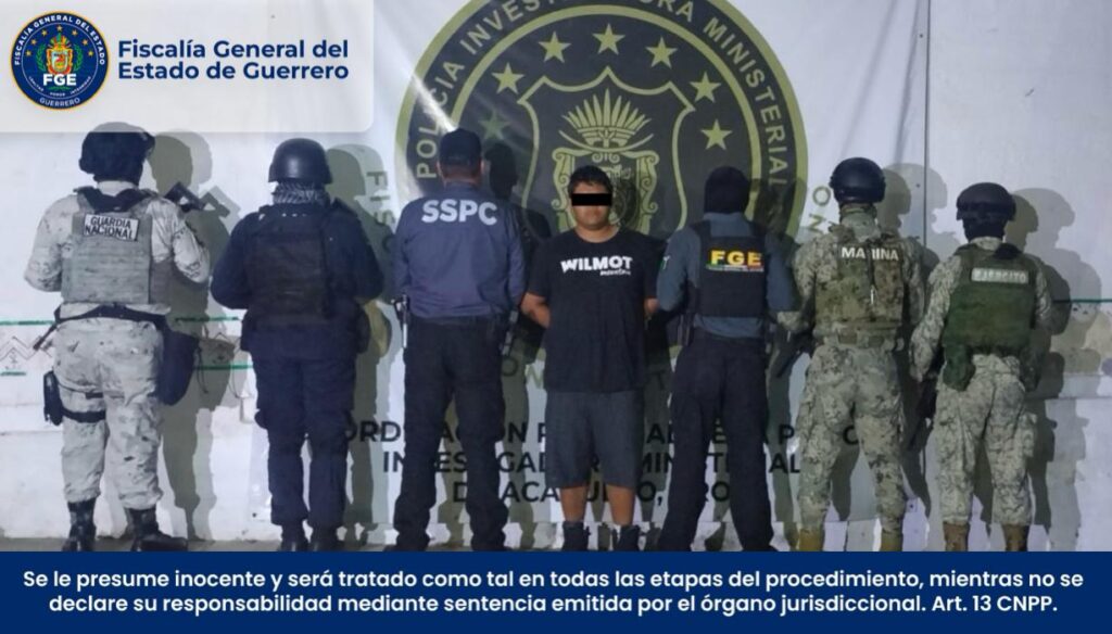 Chilpancingo, Gro., a 9 de septiembre de 2025.– La Fiscalía General del Estado de Guerrero (FGE Guerrero) informa que, como resultado de trabajos de inteligencia e investigación de campo y gabinete, agentes de la Policía Investigadora Ministerial, en coordinación con la Secretaría de la Defensa Nacional (DEFENSA), Guardia Nacional (GN), Secretaría de Marina (SEMAR), Secretaría de Seguridad y Protección Ciudadana (SSPC) y Policía Estatal, cumplimentó una orden de aprehensión en contra de René “N”, por su probable responsabilidad en el delito de Homicidio Calificado, en agravio de Jorge “N”.