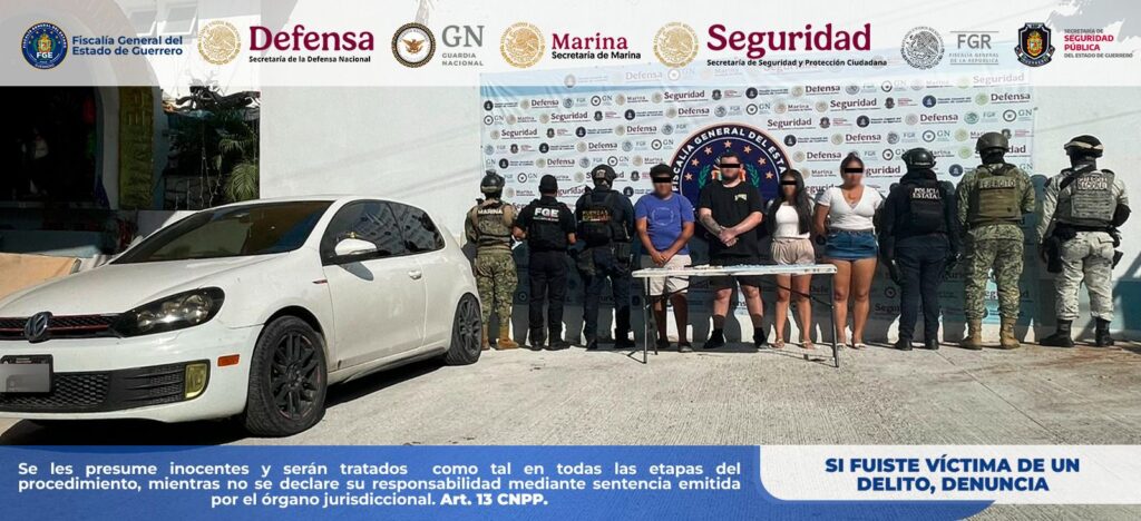 Chilpancingo, Gro., a 16 de febrero de 2026.– La Fiscalía General del Estado de Guerrero informa que, en colaboración con la Policía Estatal (SSPGro) y con el apoyo de la Secretaría de la Defensa Nacional (DEFENSA), Guardia Nacional (GN), Secretaría de Marina (SEMAR) y Secretaría de Seguridad y Protección Ciudadana (SSPC), realizó la detención en flagrancia de Martín “N”, alias “El Culichi”, Jafet “N”, Laura “N” y Vianey “N”, alias “La China”, derivado de recorridos de seguridad y vigilancia en el municipio de Acapulco de Juárez, Guerrero.