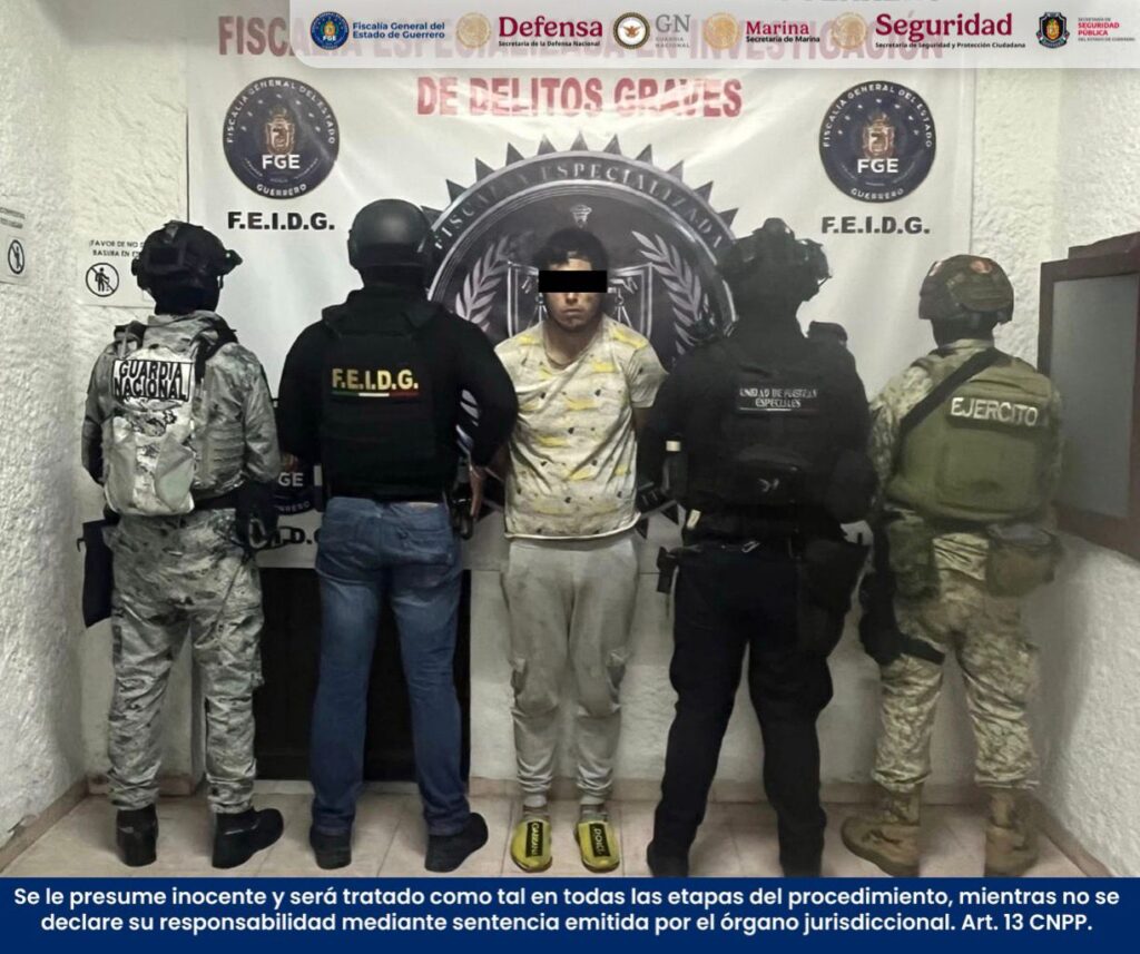 Chilpancingo, Gro., a 3 de diciembre de 2025.– La Fiscalía General del Estado de Guerrero informa que, en acciones coordinadas con la Secretaría de la Defensa Nacional (DEFENSA), Guardia Nacional (GN), Secretaría de Seguridad y Protección Ciudadana (SSPC) y Policía Estatal, fue detenido en flagrancia un masculino identificado como Carlos “N”, en el municipio de Chilpancingo de los Bravo.