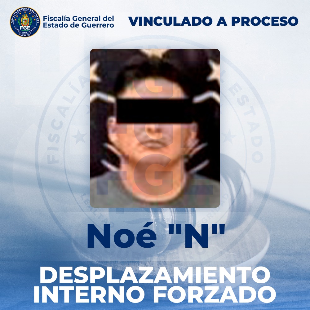 Chilpancingo, Gro., a 13 de enero de 2026.— La Fiscalía General del Estado de Guerrero informa que logró la vinculación a proceso de Noé “N” por su probable responsabilidad en el delito de Desplazamiento Interno Forzado, en agravio de cinco personas, por hechos ocurridos en Tlayolapa, municipio de Juan R. Escudero, Guerrero.