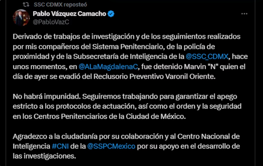“Derivado de trabajos de investigación y de los seguimientos realizados por mis compañeros del Sistema Penitenciario, de la policía de proximidad y de la Subsecretaría de Inteligencia de la @SSC_CDMX, hace unos momentos, en @ALaMagdalenaC, fue detenido Marvin “N” quien el día de ayer se evadió del Reclusorio Preventivo Varonil Oriente. No habrá impunidad. Seguiremos trabajando para garantizar el apego estricto a los protocolos de actuación, así como el orden y la seguridad en los Centros Penitenciarios de la Ciudad de México», puntualizó el funcionario en su mensaje más reciente tras la recaptura.