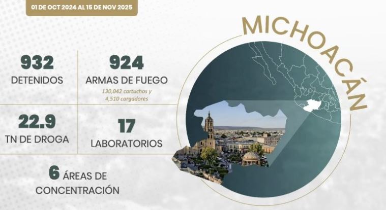 Como parte del Plan Michoacán por la Paz y la Justicia, del 10 al 26 de noviembre de 2025, dijo que se han detenido a 134 personas, además se han asegurado armas de fuego, cartuchos, cargadores, vehículos, artefactos explosivos, 425 kilos de metanfetamina, así como drogas sintéticas.