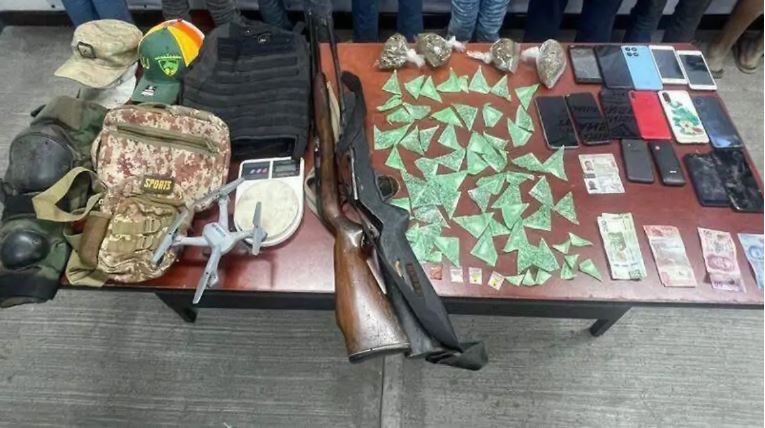 En el operativo también fueron aseguradas cuatro motocicletas, equipo táctico, un chaleco táctico, un dron, gorras con logotipos de un grupo criminal, insignias apócrifas de la Guardia Nacional, equipo de protección personal como rodilleras y coderas, así como mil 220 pesos en efectivo.