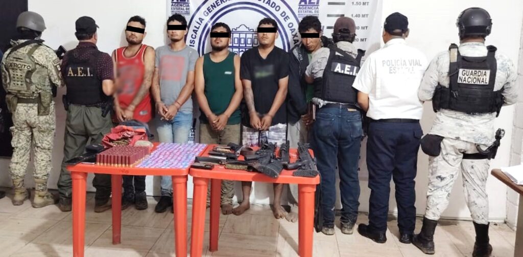• En Oaxaca, elementos de GN, Ejército Mexicano, Semar, Fiscalía y Policía Estatal detuvieron a cinco personas, les aseguraron tres armas largas, dos armas cortas, cinco cargadores, 416 cartuchos, diversas dosis de drogas, una motocicleta y un vehículo