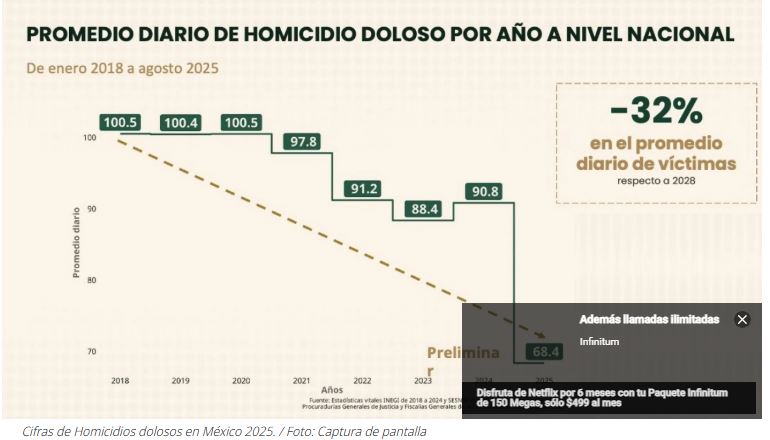El informe oficial mostró que entre septiembre de 2024 y agosto de 2025 hubo una disminución clara en la violencia homicida. Mientras que en septiembre del año pasado se reportaban en promedio 86.9 homicidios diarios, para agosto de este año la cifra cerró en 59.2 asesinatos por día, lo que equivale a 27 casos menos al día.