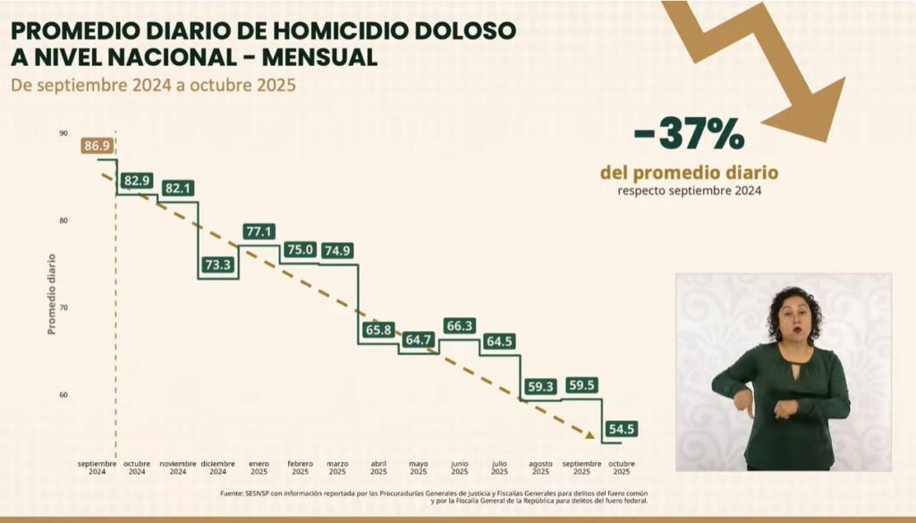 Durante una conferencia de prensa realizada el 11 de noviembre, Secretariado Ejecutivo del Sistema Nacional de Seguridad Pública (SESNSP) anunció que los homicidios dolosos en México registraron una caída del 37 % entre septiembre de 2024 y octubre de 2025, al pasar de un promedio diario de 86.9 víctimas a aproximadamente 54.6. Este descenso se presenta como uno de los logros más destacados de la gestión de Claudia Sheinbaum.