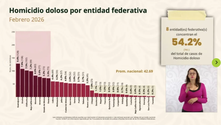 La titular del Secretariado Ejecutivo del Sistema Nacional de Seguridad Pública (SESNSP), Marcela Figueroa, informó durante la conferencia matutina del gobierno federal que el promedio diario de homicidios dolosos en México disminuyó 44% entre septiembre de 2024 y febrero de 2026.