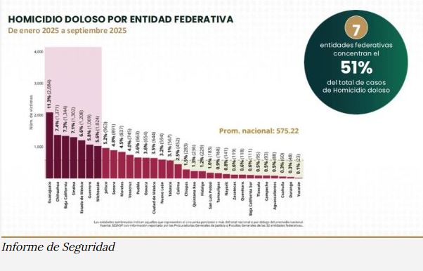 A nivel nacional, el SESNSP reportó una disminución de 32 % al comparar promedios mensuales de homicidios entre septiembre de 2024 y septiembre de 2025. Sin embargo, al analizar el periodo enero–septiembre, la reducción real es de solo 19 % frente a 2024.