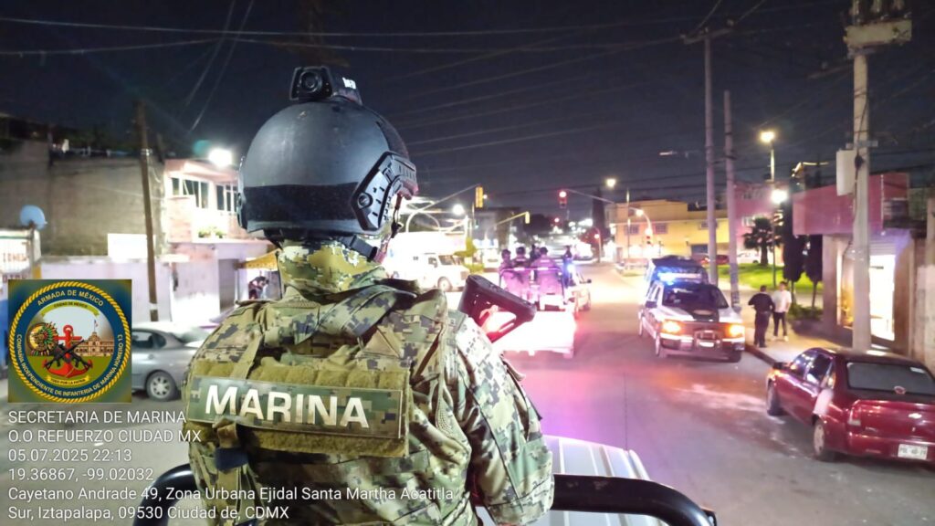 Ciudad de México.- La Secretaría de Marina, a través de la Armada de México, en el marco de apoyos de Seguridad Pública a la Ciudad de México, informa sobre los logros y acciones obtenidos durante la Orden de Operaciones “Refuerzo CDMX”, que ha llevado a cabo en coordinación con las diferentes autoridades Interinstitucionales en el mes de julio del presente año en la Ciudad de México.Dentro de este periodo, se realizaron recorridos y cateos atendiendo a diferentes alcaldías de esta ciudad, en las que se obtuvieron los siguientes resultados: se inspeccionaron 769 personas y 273 vehículos, fueron detenidas 1,221 personas, 13 armas de fuego y se aseguraron 13 inmuebles y 4,639 dosis de presuntos estupefacientes.