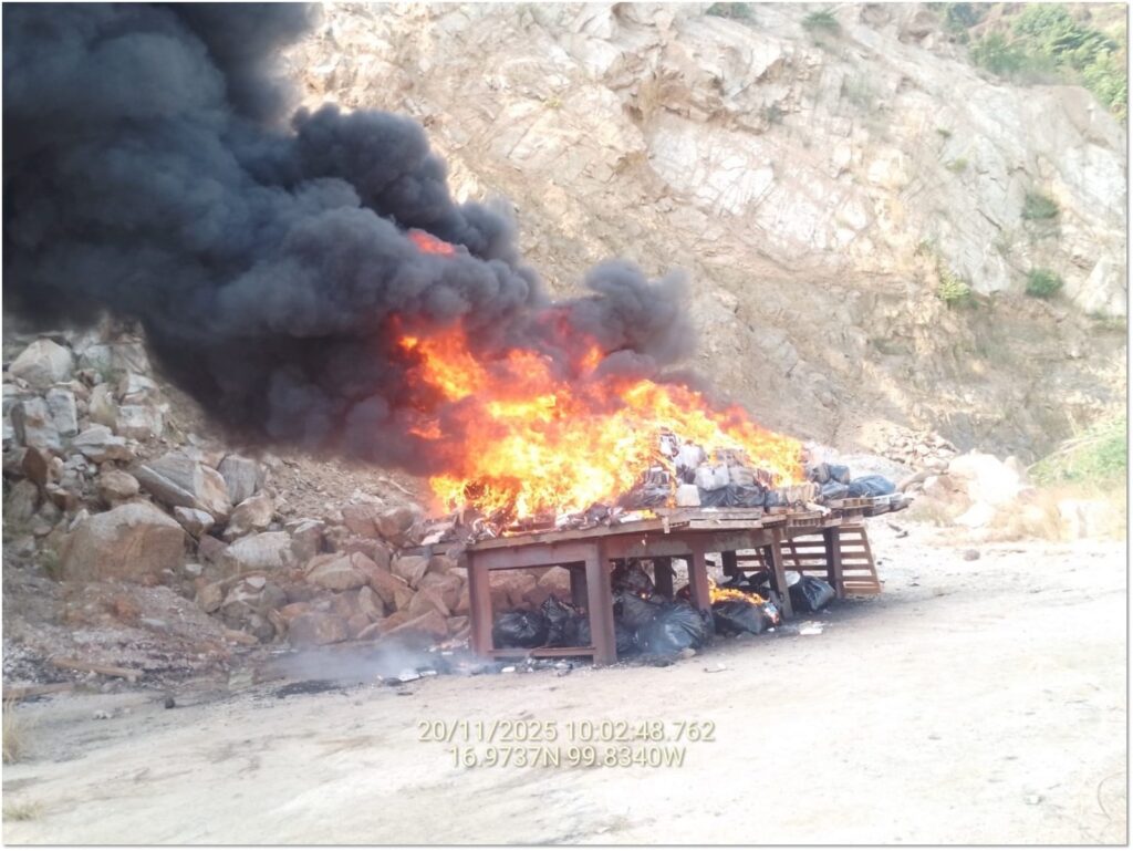Durante este acto, fueron incinerados 147 bultos tipo costalilla, cuyo peso equivale aproximadamente a 7 millones 11 mil 585 dosis individuales, que no llegarán a manos de la población y representa una merma económica aproximada de 1,303 millones 33 mil 89 pesos, para los grupos de la delincuencia organizada.