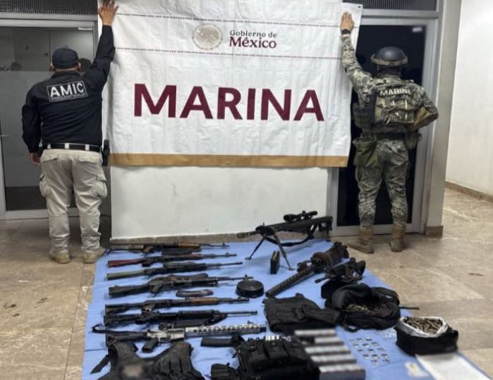 ● En Sonora, elementos de Semar y Fiscalía Estatal aseguraron 10 armas largas, 13 cargadores, 1,755 cartuchos, tres chalecos balísticos y 14 dosis de metanfetamina
