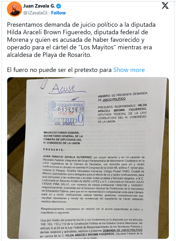 El diputado federal de Movimiento Ciudadano, Juan Ignacio Zavala Gutiérrez, presentó una demanda de juicio político contra la legisladora de Morena, Hilda Araceli Brown Figueredo, a quien se le acusa de haber colaborado con el cártel de “Los Mayitos” durante su gestión como presidenta municipal de Playas de Rosarito, Baja California.