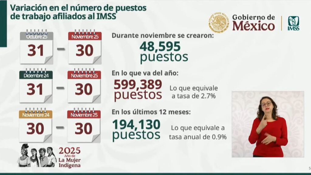 - Cifras acumuladas 2025: en los primeros 11 meses se añadieron 599,000 empleos formales.