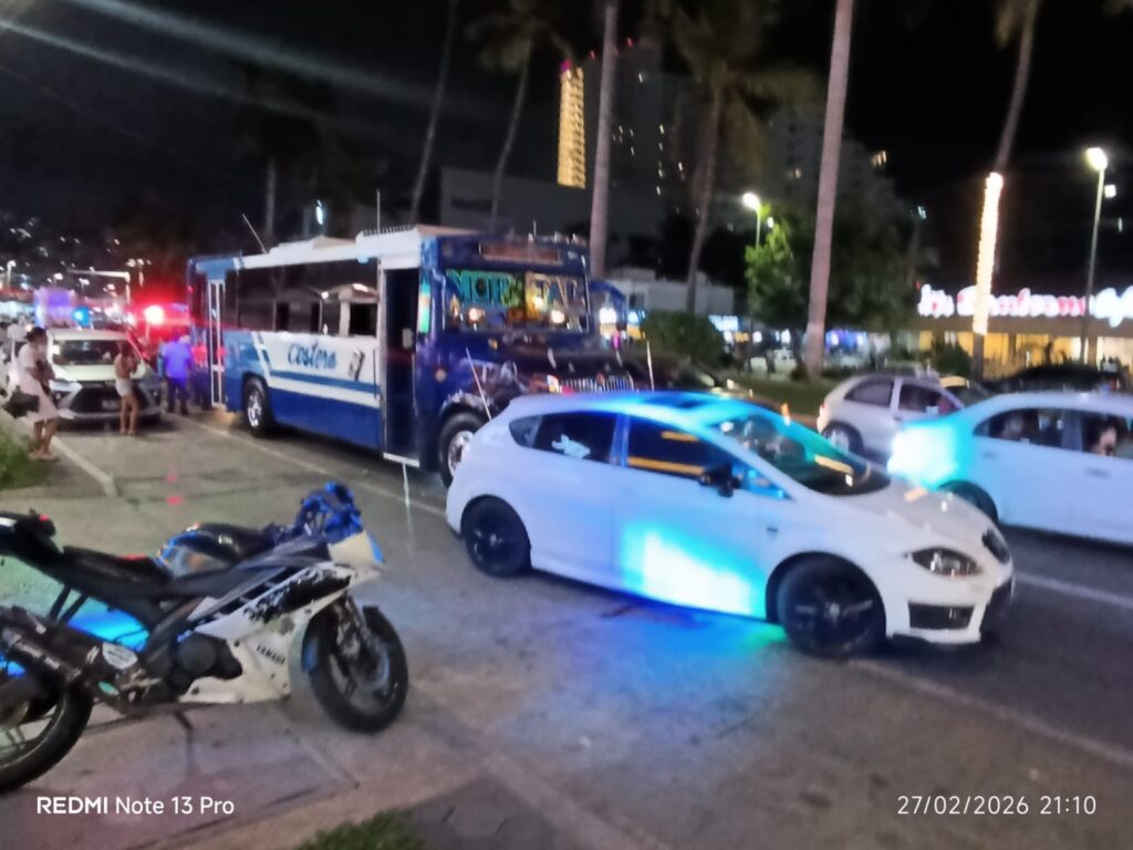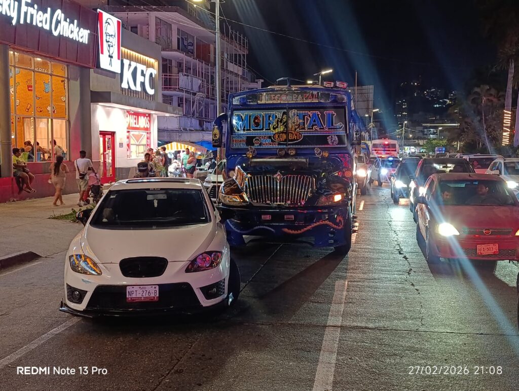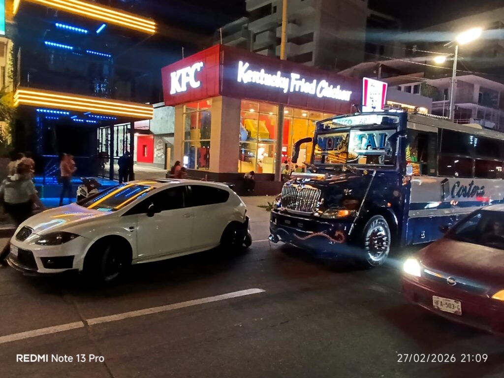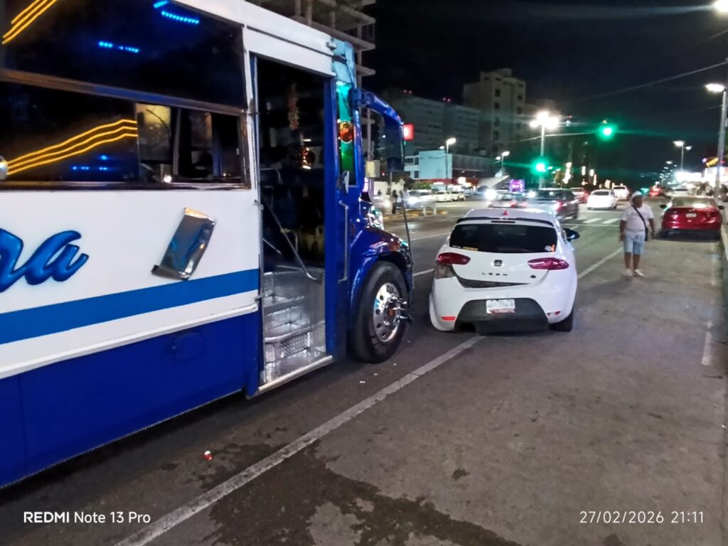 Un accidente automovilístico se registró sobre la Avenida Costera Miguel Alemán, a la altura del restaurante Sanborns Café, en el puerto de Acapulco. En el percance se vieron involucrados un vehículo particular marca Seat, color blanco, y un camión urbano del servicio público de pasajeros.