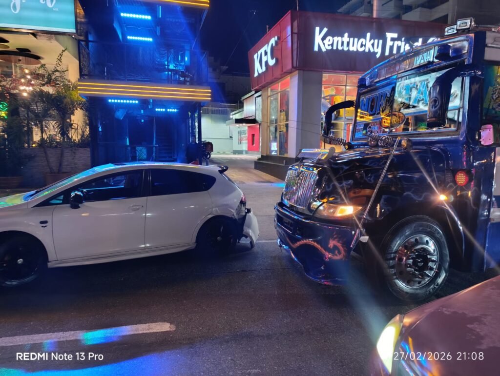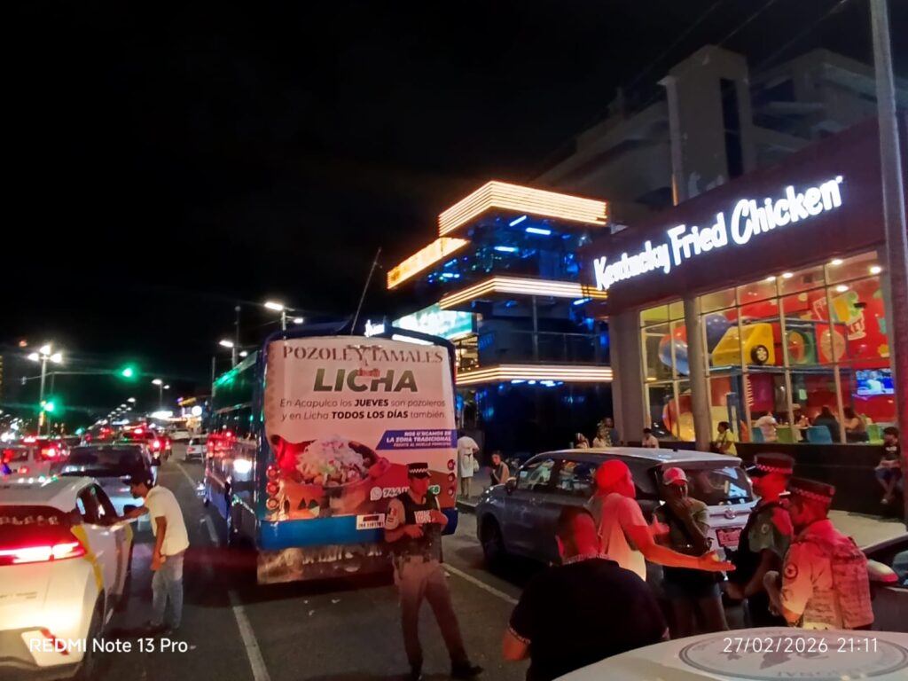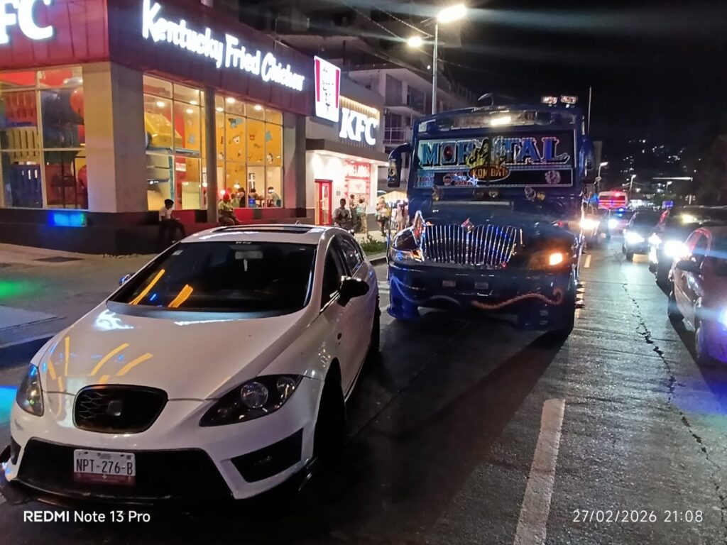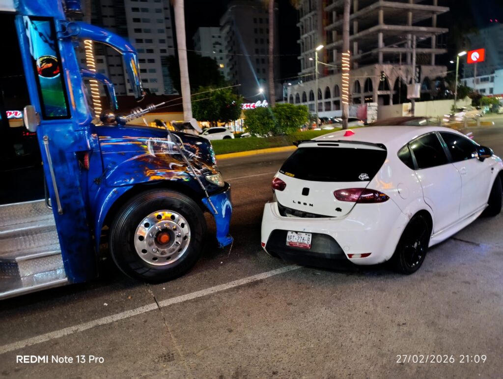 Un accidente automovilístico se registró sobre la Avenida Costera Miguel Alemán, a la altura del restaurante Sanborns Café, en el puerto de Acapulco. En el percance se vieron involucrados un vehículo particular marca Seat, color blanco, y un camión urbano del servicio público de pasajeros.