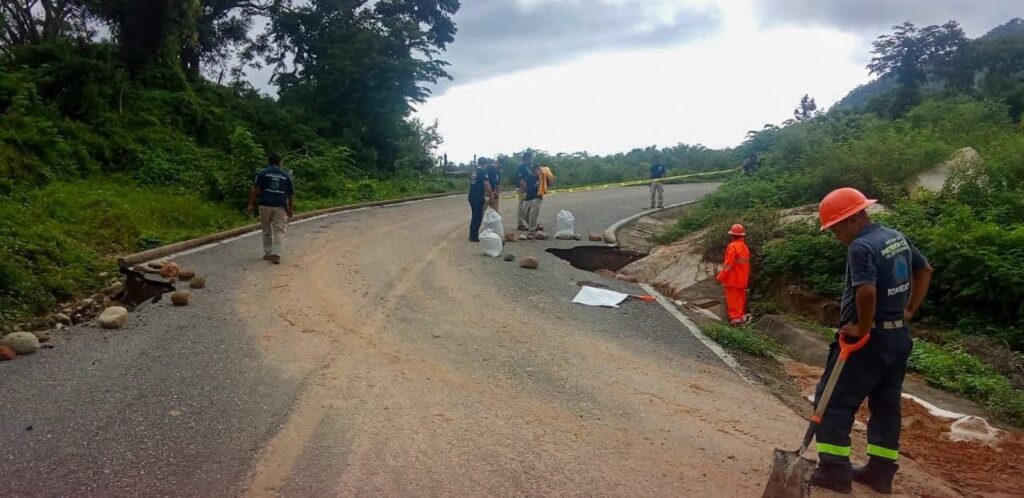Intensas lluvias generan la ruptura de un carril de la carretera Coyuca de Benítez-Yervasantita, este jueves, por lo que personal de Protección Civil del gobierno del estado se ha dado a la tarea de acordonar la zona, principalmente para evitar accidentes.