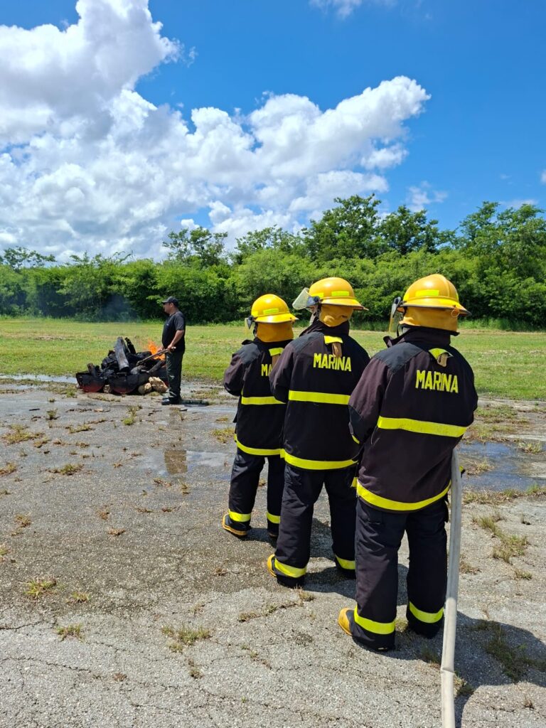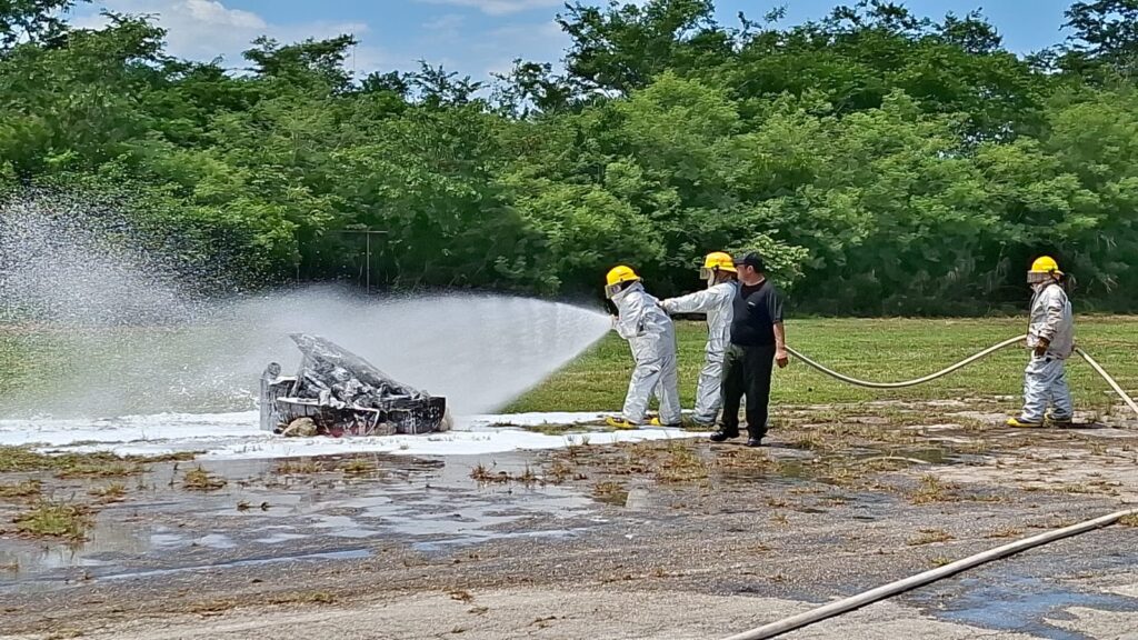 Lerma, Campeche.- La Secretaría de Marina a través de la Armada de México, por conducto de la Séptima Zona Naval informa que, ayer se realizaron prácticas con personal naval, en la simulación de un incendio de aeronave, en inmediaciones de la Base Aeronaval de Campeche, como parte de una capacitación para bomberos aeroportuarios.