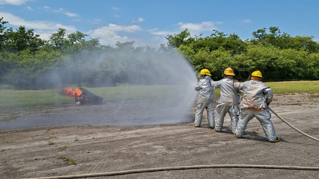 Lo anterior, contando con la participación de 10 elementos de esta Institución, como complemento práctico de conferencias impartidas por parte del SEI, mismos que emplearon equipo de protección individual, vehículos de rescate y lucha contra incendios de aeronaves, así como diferentes agentes extintores.